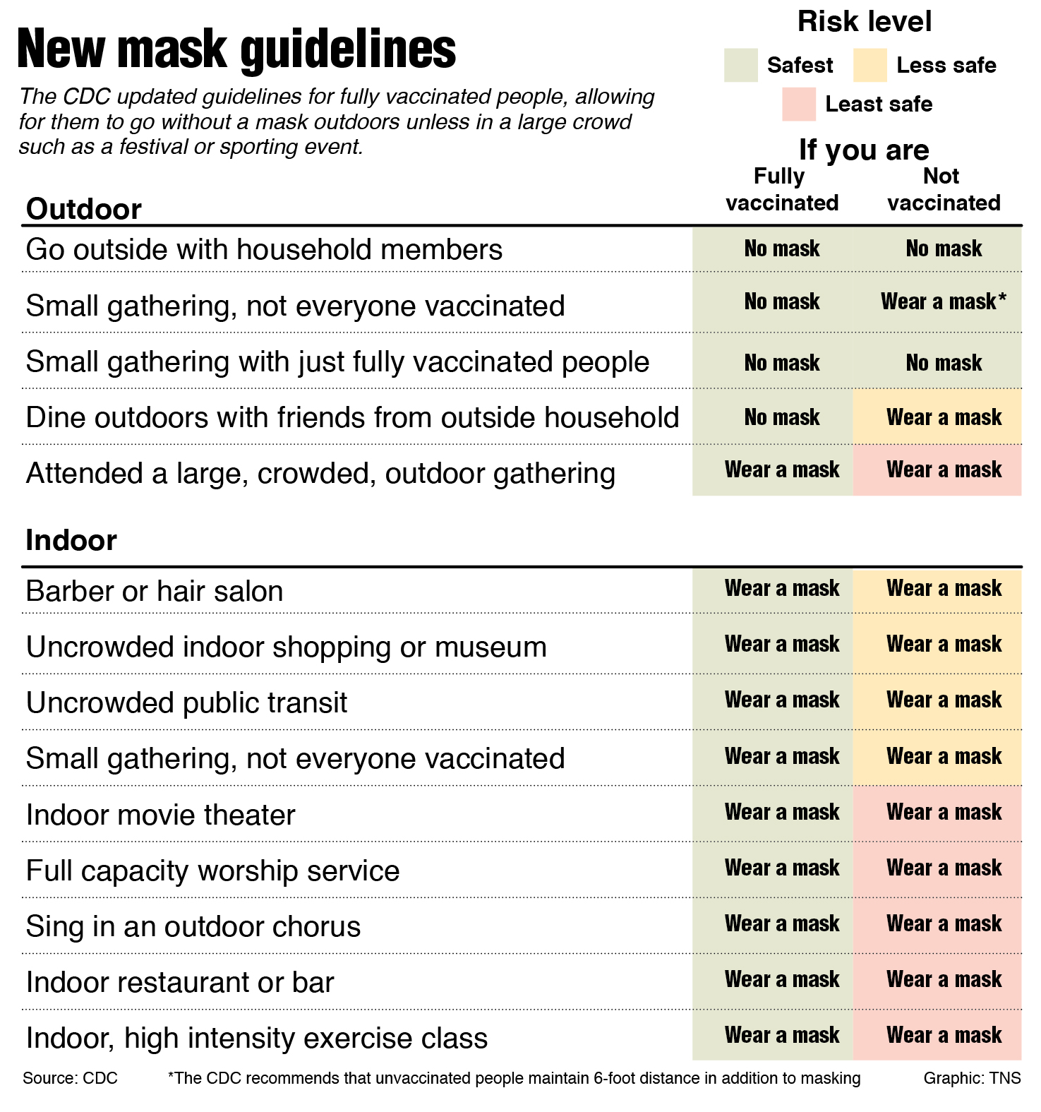 New CDC guidelines offer many Americans a break from masks ... The new recommendations do not change the requirement to wear masks on public transportation and indoors in airports, train stations and bus stations. The CDC guidelines for other indoor spaces...