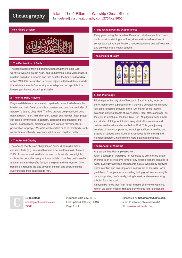 5 Pillars of Islam - Research Islam 5 Pillars of Islam They are the framework of the Muslim life: faith, prayer, concern for the needy, self-purification, and the pilgrimage to Mecca for those who are able. Shahada (Faith) Salat (Prayer) Sawm (Fasting) Zakat Hajj (Pilgrimage) PDF The Five Pillars - Harvard University Islam The Five Pillars The Five Pillars Summary: The Five Pillars of Islam are the shahadah (statements of faith), salat (prayer five times a day), zakat (giving a portion of one's possession, usually 2.5% of annual wealth, through local mosques or associations), sawm (fasting from